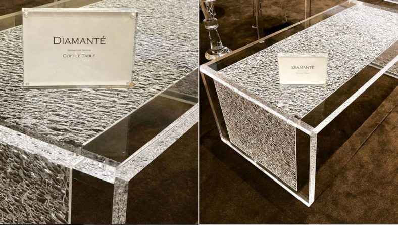 The first is called the chipped ice effect: You can see these in Our recent Diamante Series, Including the diamante side table, coffee table and console table. The chipped ice is a hand crafted surface texture that involves our crew skillfully working with hammers and chisels to chip away excess pieces of Acrylic- We do this very precisely to make sure the cracks are just deep enough to let the perfect amount of light through. This gives the pieces a “bubble” effect as the light is refracted in all directions!