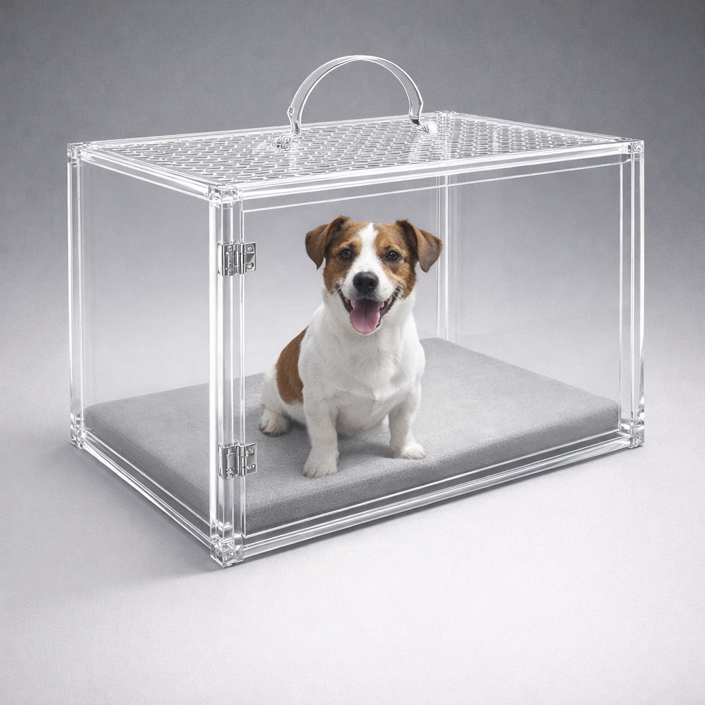 The Fifth Avenue Lucite Pet Crate is a modern clear acrylic enclosure designed as luxury pet furniture for dogs, cats, and small animals. Crafted from premium lucite panels, this transparent pet crate blends refined architectural design with everyday functionality.