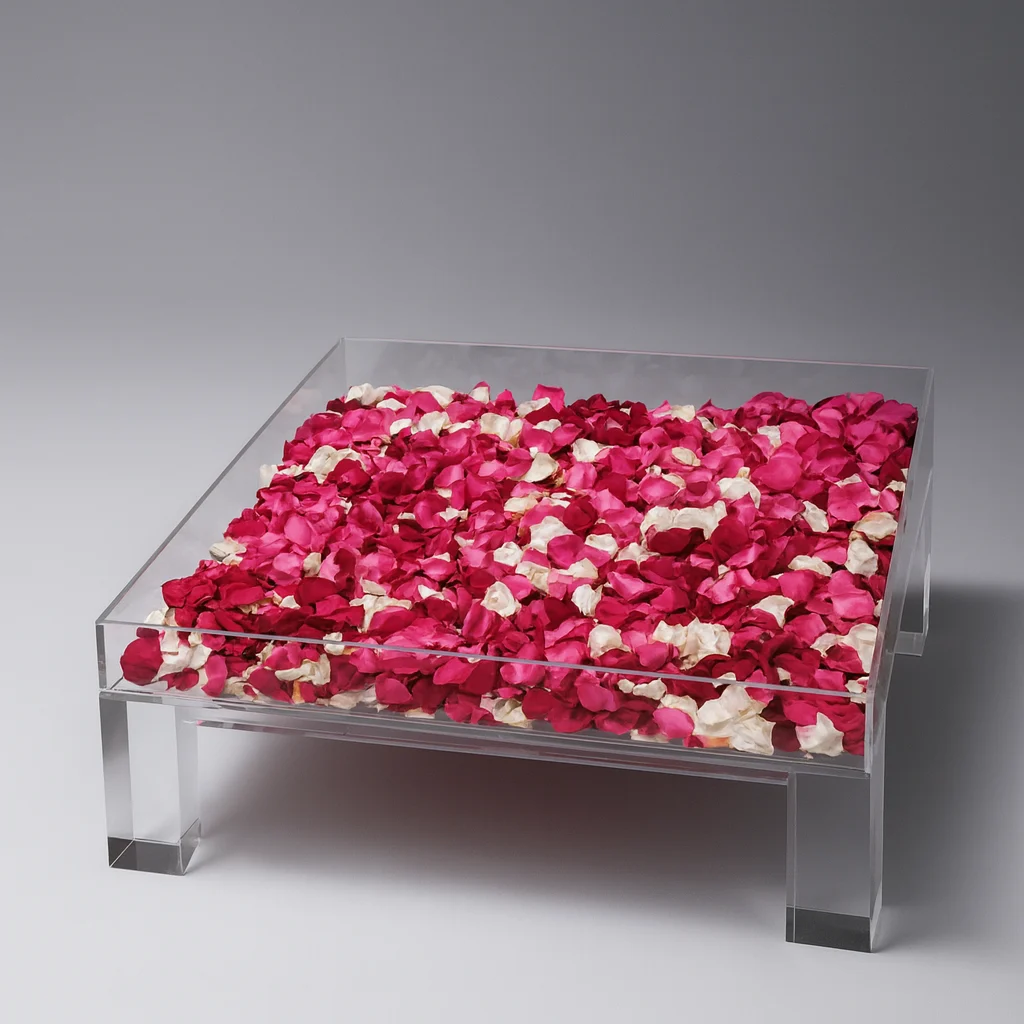 Pandora’s Coffee Table is the newest addition to Plexi-craft’s gorgeous line of 100% acrylic furniture products. This luxurious shadow box is fabricated with four stunning solid 4” thick acrylic legs and four crystal-clear 1/2” sides and top for maximum 360-degree visibility. The removable Roman top can be lifted to change out your precious contents, which can be anything you imagine.