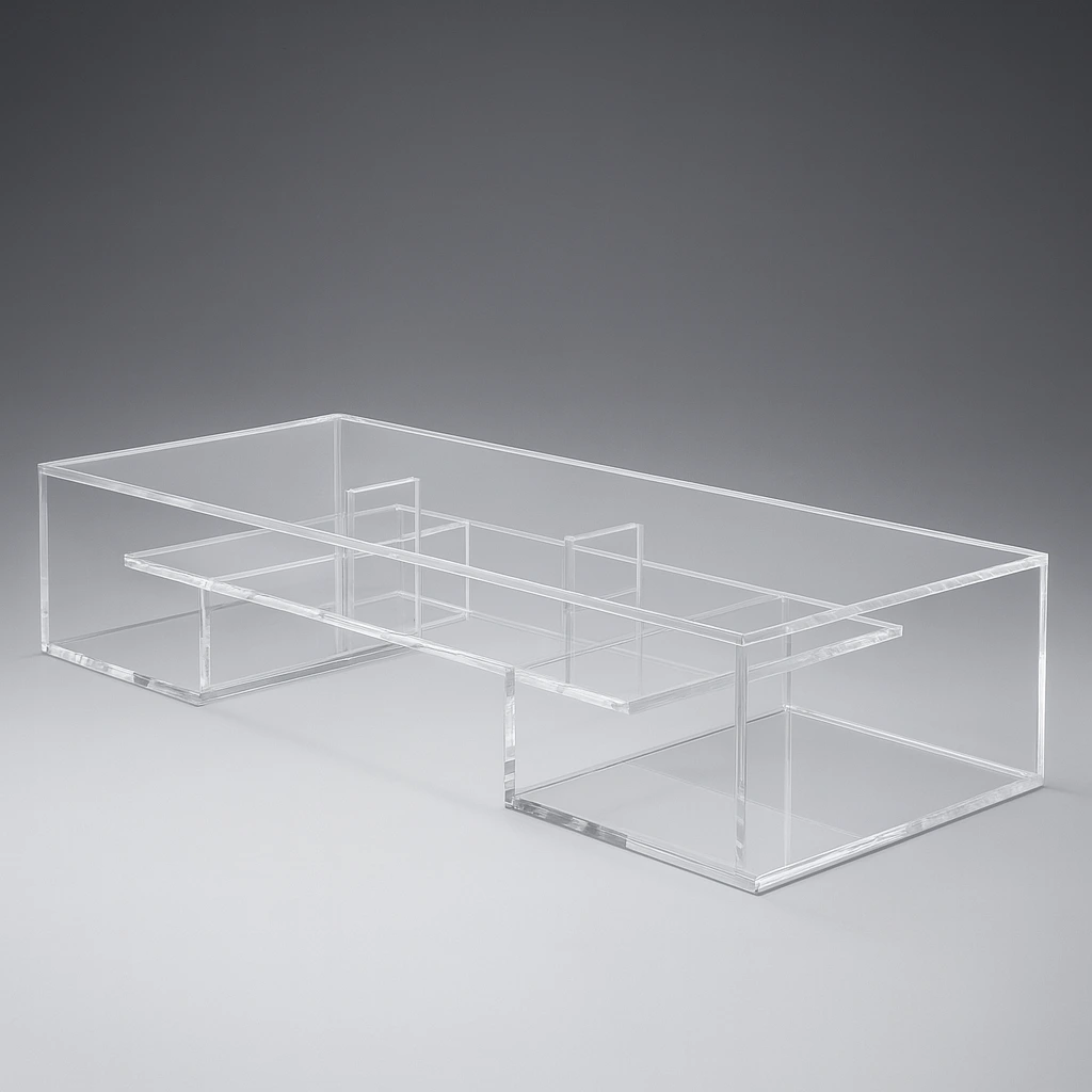 The Thea Table is Plexi-craft’s experimentation with acrylic curves. A perfectly cut acrylic circle sits atop three strips of acrylic, each expertly heated and bent to the correct shape by our craftsmen. This table can be made to any dimension you desire. Our team is happy to accommodate your specifications.